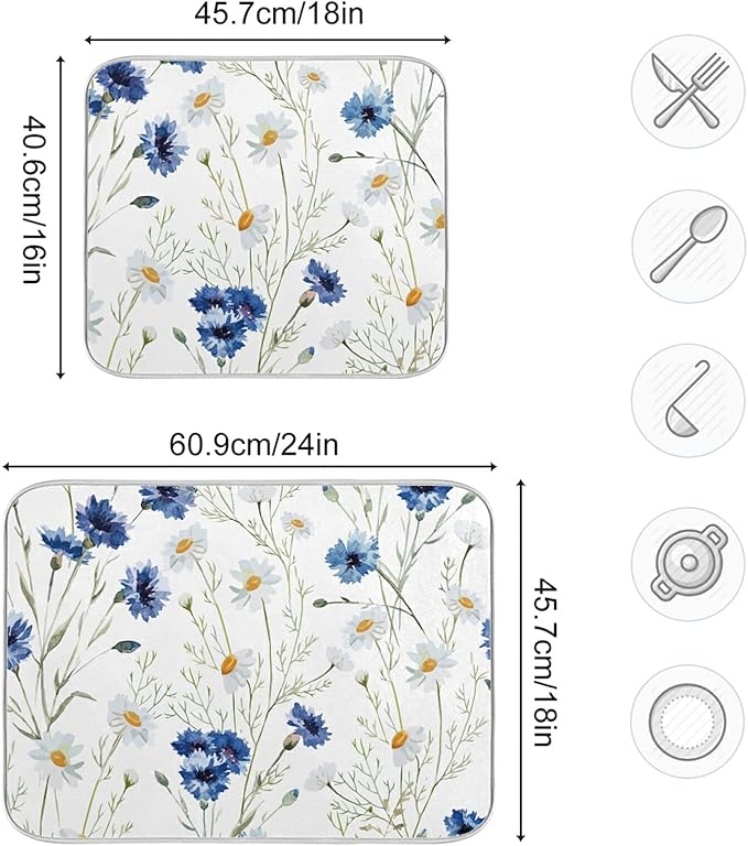 Daisy White Dish Drying Mat for Kitchen Counter, Microfiber Absorbent Dish Draining Mat, Large Kitchen Drying Mat Heat Resistant Drying Pad for Counter 18x24