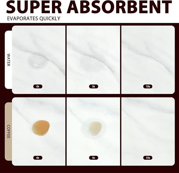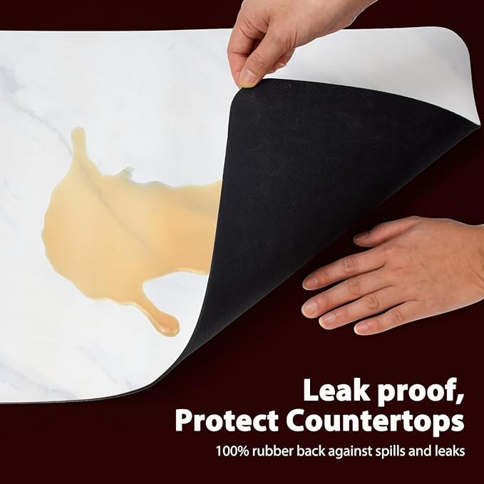 - SUPER ABSORBENT & QUICK DRY: The kitchen counter mats are made from diatomaceous earth, breathing leather surface and natural rubber base; Diatomaceous earth can hold up to 150% of its weight in moisture and evaporates quickly